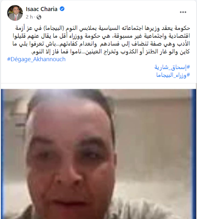 وكتب: "حكومة يعقد وزيرها اجتماعاته السياسية بملابس النوم (البيجاما) في عز أزمة اقتصادية واجتماعية غير مسبوقة، هي حكومة ووزراء أقل ما يقال عنهم قليلوا الأدب وهي صفة تنضاف إلى فسادهم وانعدام كفاءتهم.".