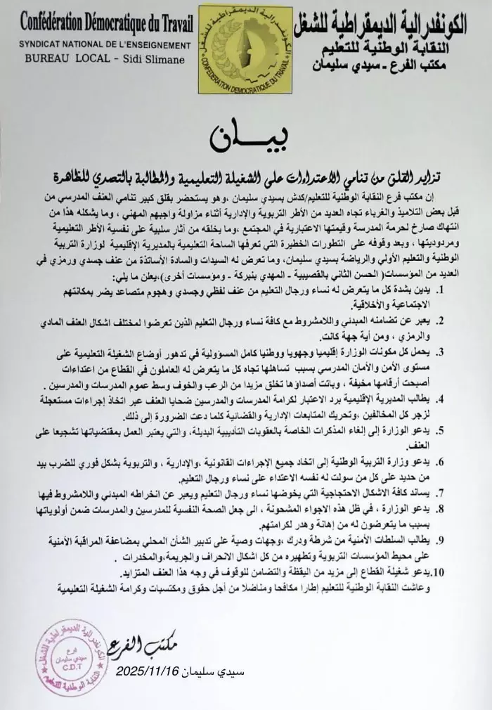 وتؤكد النقابة أن ما يجري اليوم يشكل مساسًا خطيرًا بهيبة المدرسة العمومية وقيمتها داخل المجتمع، بعد أن طالت الاعتداءات الجسدية والرمزية عددًا من الأساتذة في مؤسسات تعليمية مختلفة، وهو ما دفع المكتب النقابي إلى إصدار بيان مطول يعلن فيه استنكاره لكل أشكال العنف، محملًا مسؤولية هذا الوضع المتأزم للوزارة على مختلف مستوياتها، ومطالبًا بتدخلات عاجلة تعيد الاعتبار لكرامة الشغيلة التعليمية وتضع حدًا للتطاول على الأطر التربوية، مع التشديد على ضرورة تعزيز الأمن بمحيط المؤسسات وتوفير الحماية اللازمة للأساتذة داخل الفضاء المدرسي وخارجه.