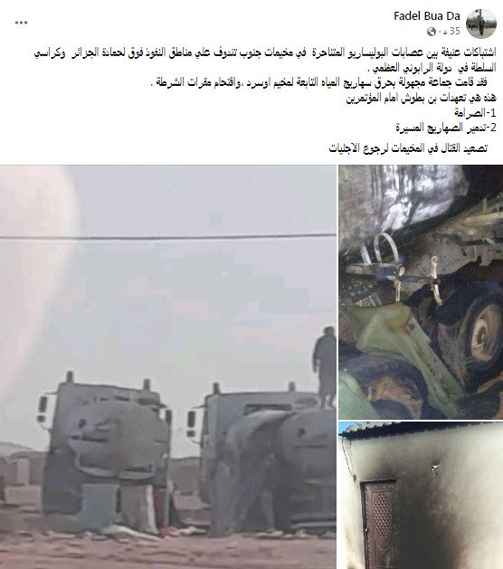 مغربنا1_الصحراء المغربية تعيش مخيمات تندوف خلال اليومين الأخيرين، على وقع مواجهات عنيفة بين الميليشيات المسلحة، بعد شيوع أخبار انشقاق ثلاثة قادة كانوا معروفين وسط الميليشيات المسلحة المسيطرة على مخيمات المحتجزين بدعم وإشراف من الجيش الجزائري. مصادر من داخل المخيمات، كشفت عبر صفحات فايسبوكية مهتمة بمخيمات تندوف، عن تبادل كثيف لإطلاق النار ي مخيمات جنوب تندوف علي مناطق النفوذ فوق لحمادة الجزائر وكراسي السلطة في بالرابوني. ووفق ذات المصدر فقد قامت جماعة مجهولة بحرق سهاريج المياه التابعة لمخيم اوسرد ،واقتحام مقرات الشرطة . هذا الهجوم الجديد يفند كل الادعاءات الكاذبة التي عادة ما تروجها العصابة الإنفصالية. حول استتباب الأمن داخل مخيمات تندوب. وتنفي ما تزعمه الجبهة حول الأمن المستتب داخلها. و يؤكد أن حياة و أمن المحتجرزين في المخيمات على كف عفريت. نتيجة انتشار الفوضى وحالة اللأمن التي تسود هذه المخيمات الواقعة على الأراضي الجزائرية.