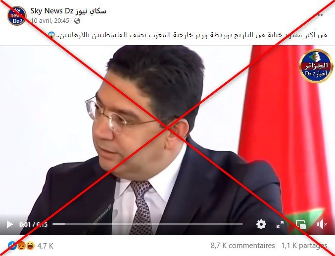 مغربنا1_الرباطنشرت صفحات جزائرية على مواقع التواصل الاجتماعي مقطع فيديو زعمت أنه يظهر وزير الخارجية ناصر بوريطة وهو يصف الفلسطينيين بالإرهابيين، وذلك في ظل تصاعد التوتر بين الفلسطينيين والإسرائيليين في الأيام الماضية، حسب خدمة فرانس برس لتقصي الحقائق.