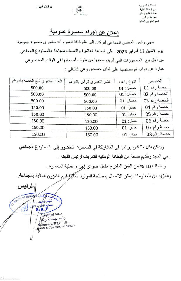 وجاء في الإعلان الذي توصل “الأول” بنسخة منه، أن المجلس الجماعي للمدينة أطلق سمسرة عمومية يوم الإثنين 13 فبراير، بالمستودع الجماعي من أجل بيع المحجوزات التي لم يتم سحبها من طرف أصحابها في الوقت المحدد وهي عبارة عن دواب.