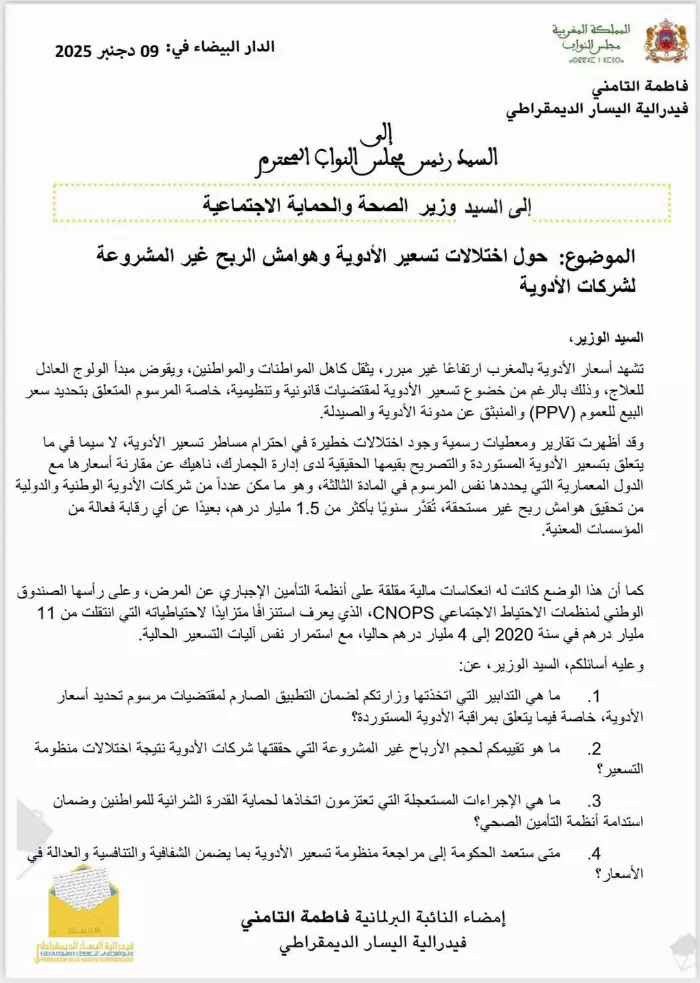 الأخطر أن هذه الفوضى في التسعير انعكست مباشرة على أنظمة التأمين الصحي، وعلى رأسها الصندوق الوطني لمنظمات الاحتياط الاجتماعي CNOPS، الذي تراجعت احتياطاته من 11 مليار درهم سنة 2020 إلى 4 مليار درهم فقط، مما ينذر بأزمة مالية خطيرة تهدد استمرارية التغطية الصحية. ومن داخل هذه المعطيات الثقيلة، تطالب التامني الوزير بتوضيحات عاجلة حول التدابير الرقابية، وتقييم الأرباح غير المشروعة، والإجراءات المستعجلة لحماية المواطنين، إضافة إلى موعد مراجعة منظومة التسعير بما يضمن الشفافية والعدالة في السوق الدوائية.