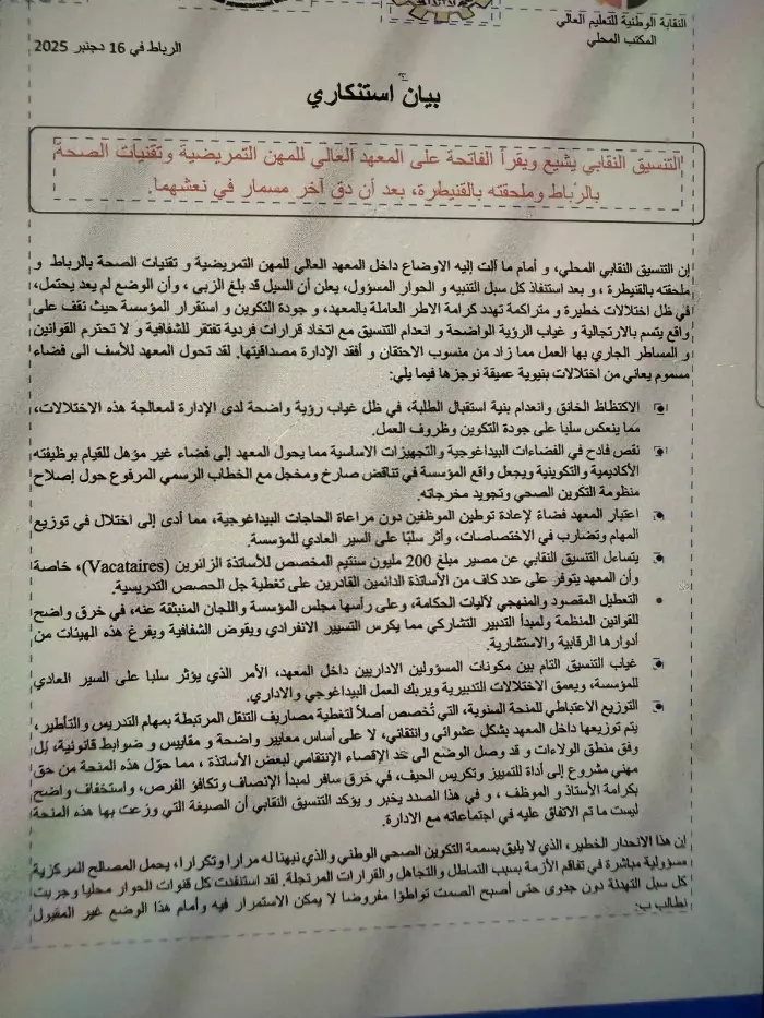 وفي ختام البيان، أكد التنسيق النقابي حرصه على إيجاد حلول واقعية ومسؤولة تضمن كرامة الشغيلة وتحسين ظروف العمل وجودة التكوين، غير أنه حذّر من استمرار منطق التسويف والتجاهل، مشيرًا إلى أن جميع قنوات الحوار مع إدارة المعهد قد استنفدت دون نتائج ملموسة، رغم الوعود المتكررة بفتح حوار مباشر مع الوزارة الوصية، مؤكّدًا أنه في حال استمرار هذا الوضع غير المقبول، فإنه لن يتردد في اللجوء إلى أشكال نضالية تصعيدية سيتم الإعلان عنها في الوقت المناسب، دفاعًا عن الحقوق المشروعة وصونًا لكرامة الأطر وحفاظًا على مستقبل المعهد وسمعة التكوين الصحي الوطني.