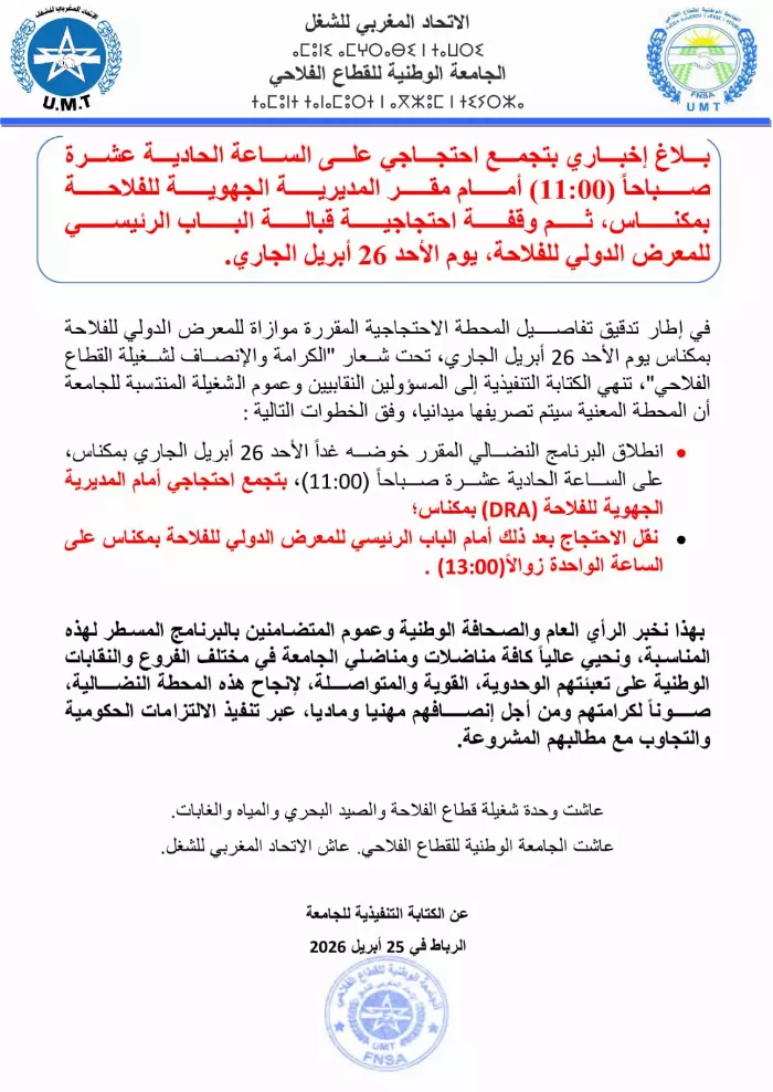 البلاغ الصادر عن الإطار النقابي أعلن بشكل واضح عن تنظيم تجمع احتجاجي صباح الأحد 26 أبريل أمام مقر المديرية الجهوية للفلاحة، قبل نقل المعركة إلى قلب الحدث أمام البوابة الرئيسية للمعرض الدولي للفلاحة، في رسالة مباشرة بأن الاحتجاج هذه المرة لن يبقى في الهامش، بل سيتجه إلى واجهة المشهد حيث تُعرض “إنجازات” القطاع أمام الرأي العام.