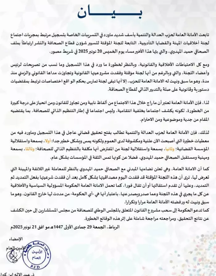 وفي ختام البلاغ، طالب الحزب الحكومة بسحب مشروع القانون المتعلق بالمجلس الوطني للصحافة من مجلس المستشارين إلى حين ظهور نتائج التحقيق المرتقب، مع مراجعته مراجعة شاملة على ضوء هذه “الوقائع الخطيرة”، معتبرًا أن ما جرى يشكل منعطفًا حساسًا يحتاج إلى وضوح، محاسبة، وترميم جذري للثقة في مؤسسات القطاع.