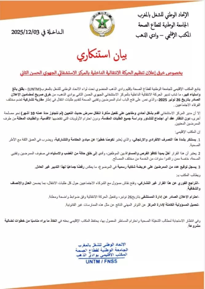 وطالب المكتب بالتراجع الفوري عن القرار وفتح نقاش مسؤول مع الشركاء الاجتماعيين لضمان الإنصاف والشفافية، مع التشديد على ضرورة احترام الإعلان الرسمي للحركة الانتقالية وتحميل إدارة المستشفى مسؤولية ما يترتب عن هذه الممارسات من اضطراب مهني داخل المؤسسة.