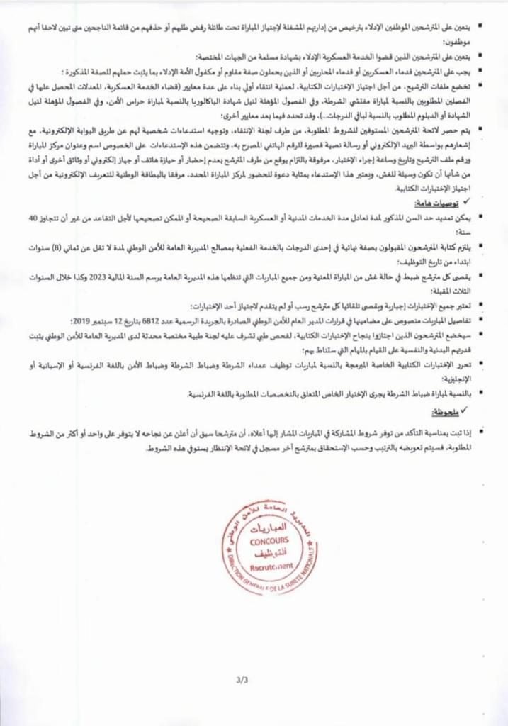 وستفتح المباريات، في وجه المترشحين المتوفرين على الشروط النظامية المنصوص عليها في الفصل الـ21 من النظام الأساسي العام. ومنها التوفر على قوة بصرية يبلغ مجموعها 10/15 على الأقل من غير استعمال نظارات أو عدسات أو أية وسيلة أخرى يمكنها رفع القوة البصرية، والتوفرعلى قوة سمع تمكّن من سماع الهمس على بعد نصف متر، والأهلية البدنية والنفسية لمزاولة المهام التي ستناط بهم.