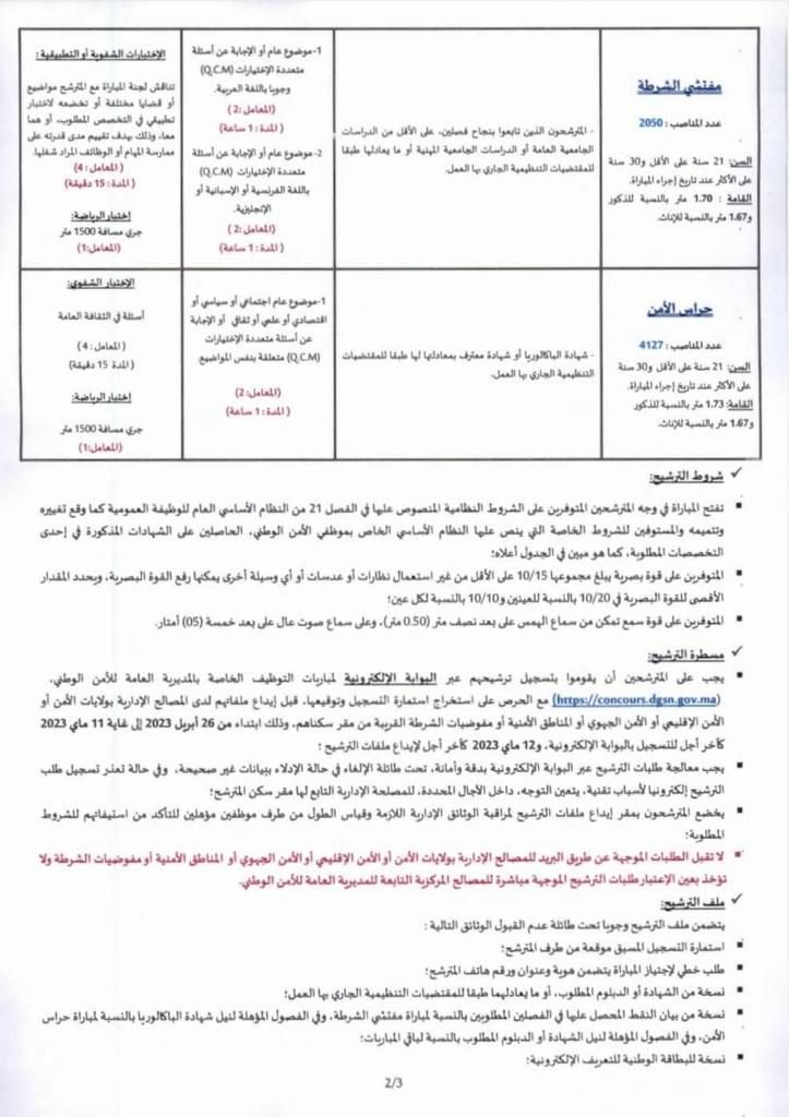 وحددت المديرية عدد المناصب الخاصة بمنصب “عمداء الشرطة”، في 130 منصب، و250 منصبا لضباط الشرطة، فيما خُصّص 50 منصبا لفائدة ضباط الأمن و2050 منصبا لمفتشي الشرطة و4 آلاف و127 منصب لحراس الأمن.