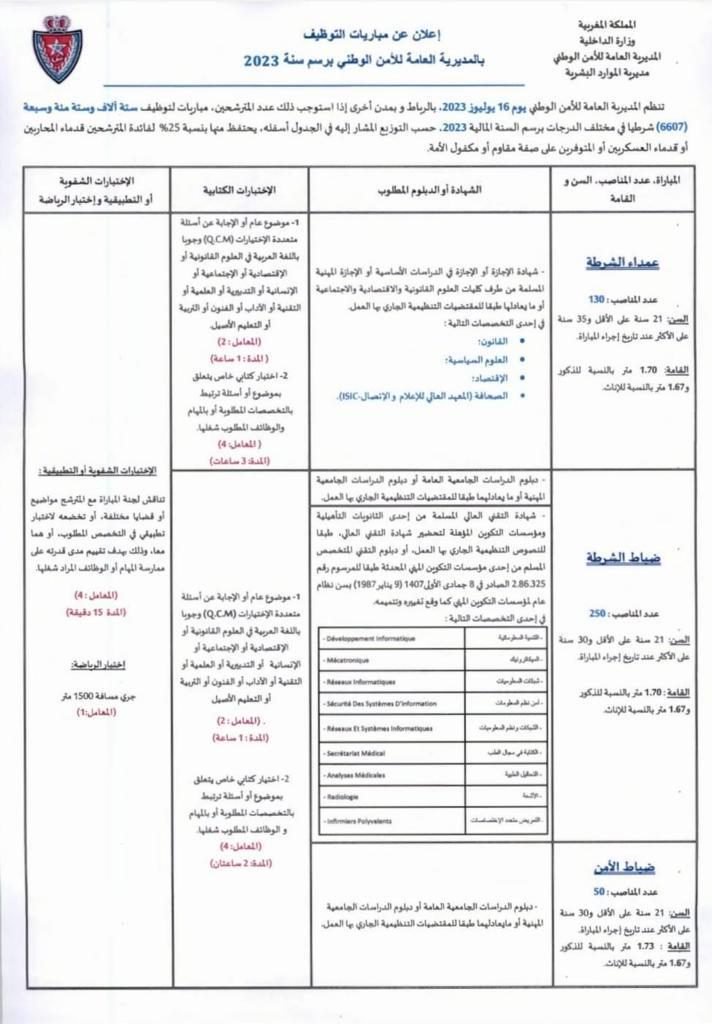 أعلنت المديرية العامة للأمن الوطني، الثلاثاء، عن تنظم مباريات للتوظيف في أسلاك الشرطة، يوم 16 يوليوز المقبل، بعدة مدن، تهم توظيغ أزيد من 6 آلاف رجل أمن جديد.